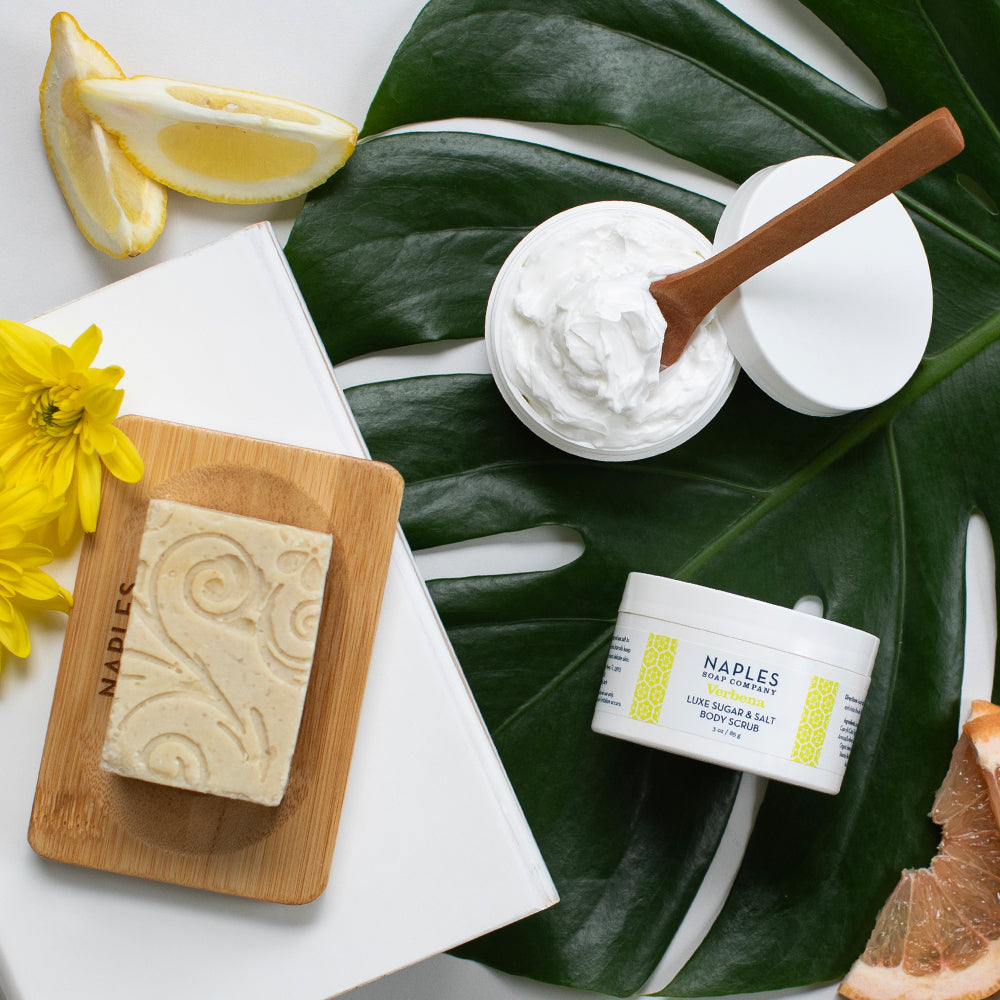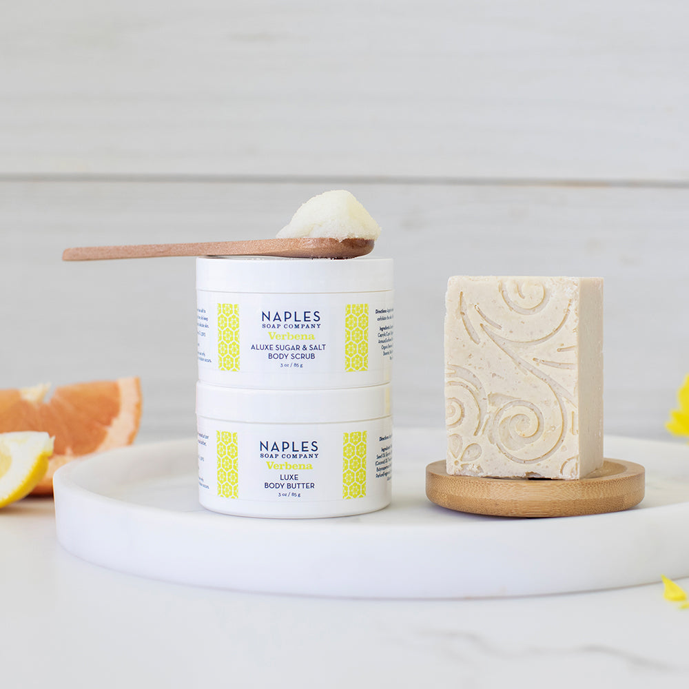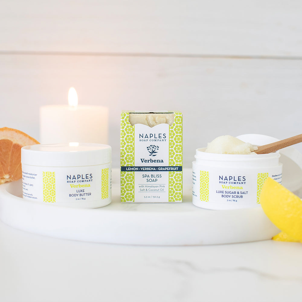 What's Inside: Verbena Luxe Body Butter 3 oz, Verbena Luxe Sugar & Salt Body Scrub 3 oz, Verbena Spa Bliss Soap