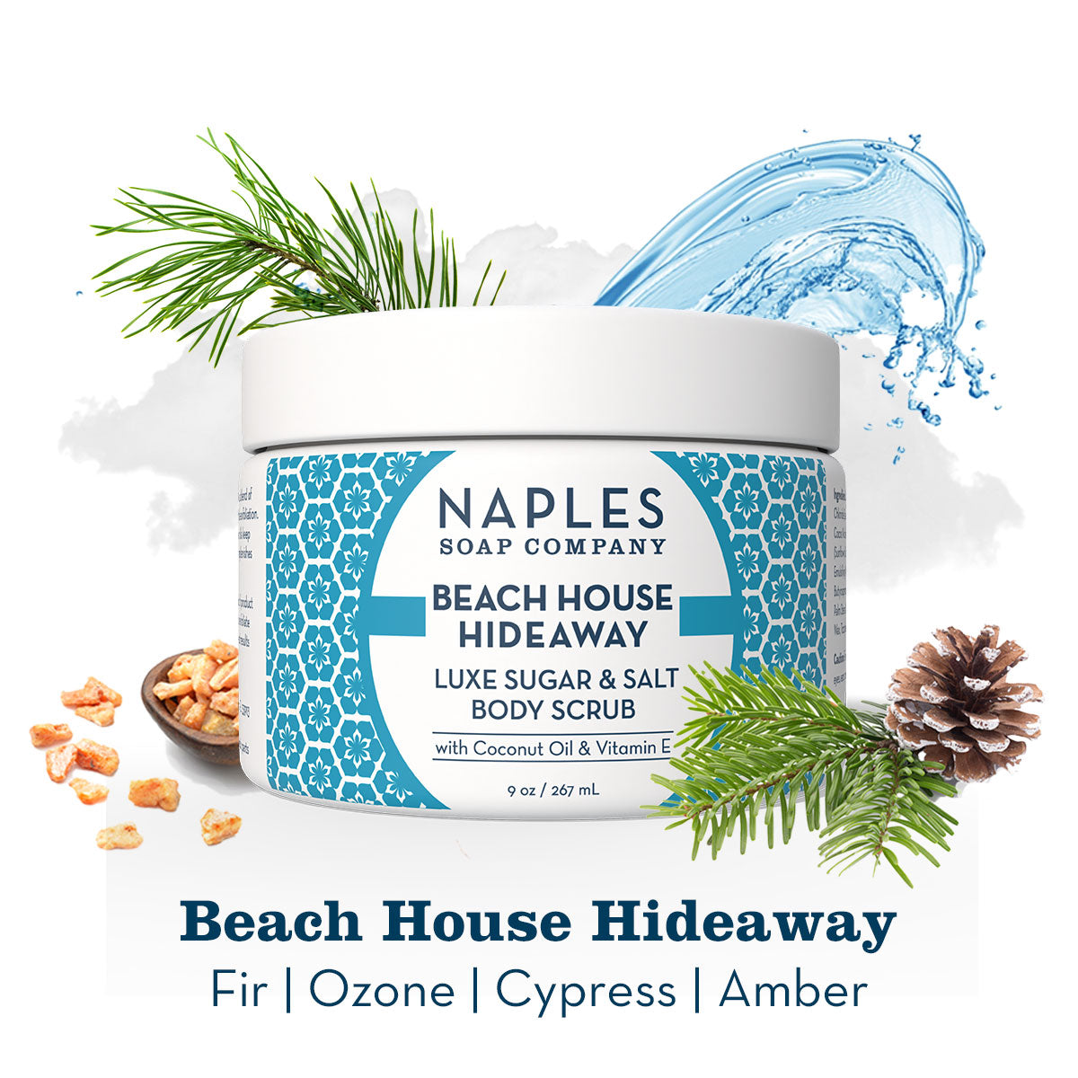 Escape to a coastal retreat with our Beach House Hideaway Luxe Sugar & Salt Body Scrub. This indulgent scrub blends sugar and sea salt to gently exfoliate, while organic coconut oil nourishes and softens skin for a silky-smooth finish. The scent evokes a serene beach getaway with notes of fresh fir, crisp ozone, and warm amber — the perfect way to bring the calming vibes of the shoreline to your daily routine.