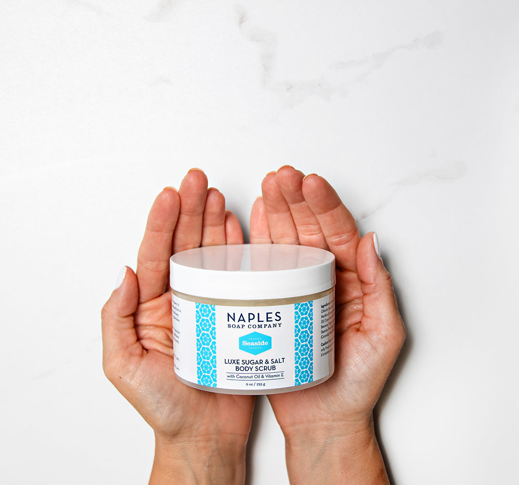- Place a container of our Sugar & Salt Scrub in your shower and by your sink to use as needed on the hands and body