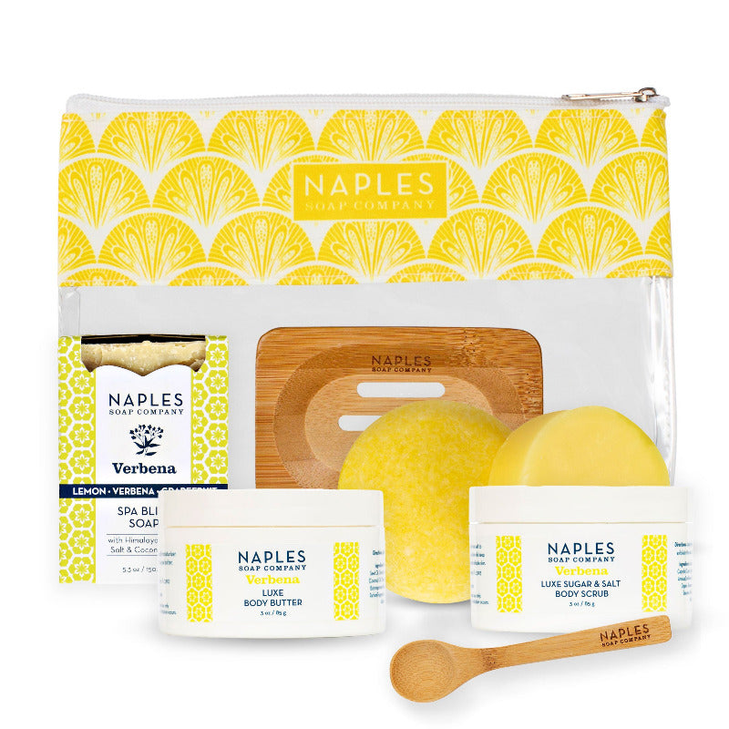 A Peek Inside the Set: Verbena Luxe Body Butter, Verbena Luxe Sugar & Salt Body Scrub, Verbena Spa Bliss Soap, Verbena Shampoo Bar, Verbena Conditioner Bar, Wooden Spoon, Verbena Cosmetic Pouch