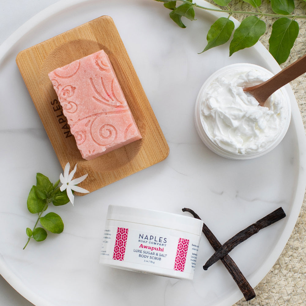 What's Inside: Awapuhi Luxe Body Butter, Awapuhi Luxe Sugar & Salt Body Scrub, Awapuhi Spa Bliss Soap, Awapuhi Shampoo Bar, Awapuhi Conditioner Bar, Awapuhi Cosmetic Pouch, Wooden Spoon