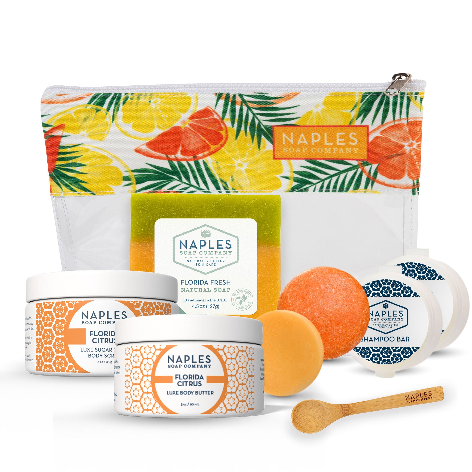 What's Inside: Florida Fresh Natural Soap, Florida Citrus Luxe Body Butter, Florida Citrus Luxe Sugar & Salt Body Scrub, Florida Fresh Shampoo Bar, Florida Fresh Conditioner Bar, (2) Hair Bar Travel Cases, Mini Wooden Spoon, Clear Cosmetic Bag
