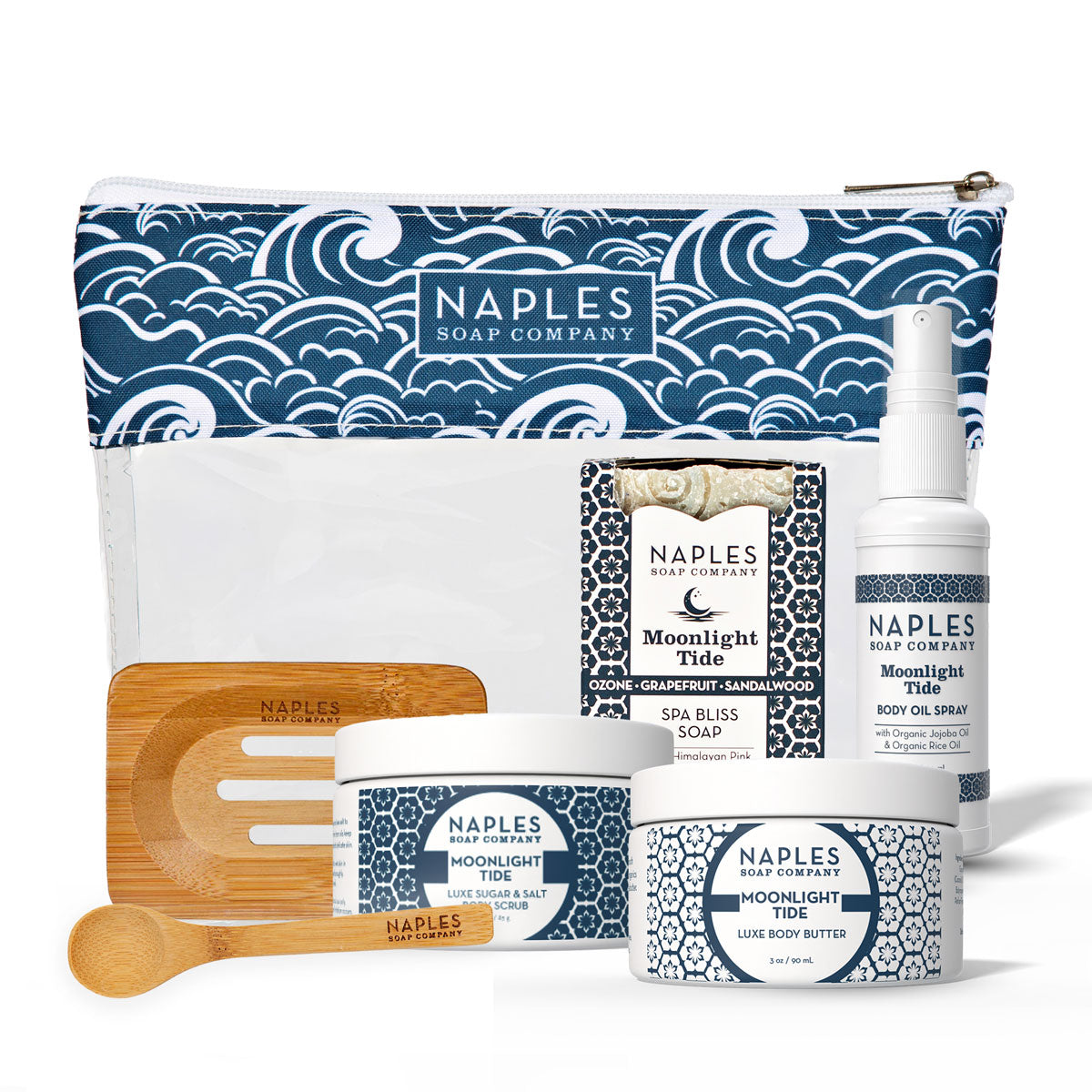 What's Inside: Moonlight Tide Spa Bliss Soap, Moonlight Tide Luxe Body Butter, Moonlight Tide Luxe Sugar & Salt Body Scrub, Moonlight Tide Body Oil Spray, Wooden Soap Dish, Wooden Spoon, Cosmetic Case