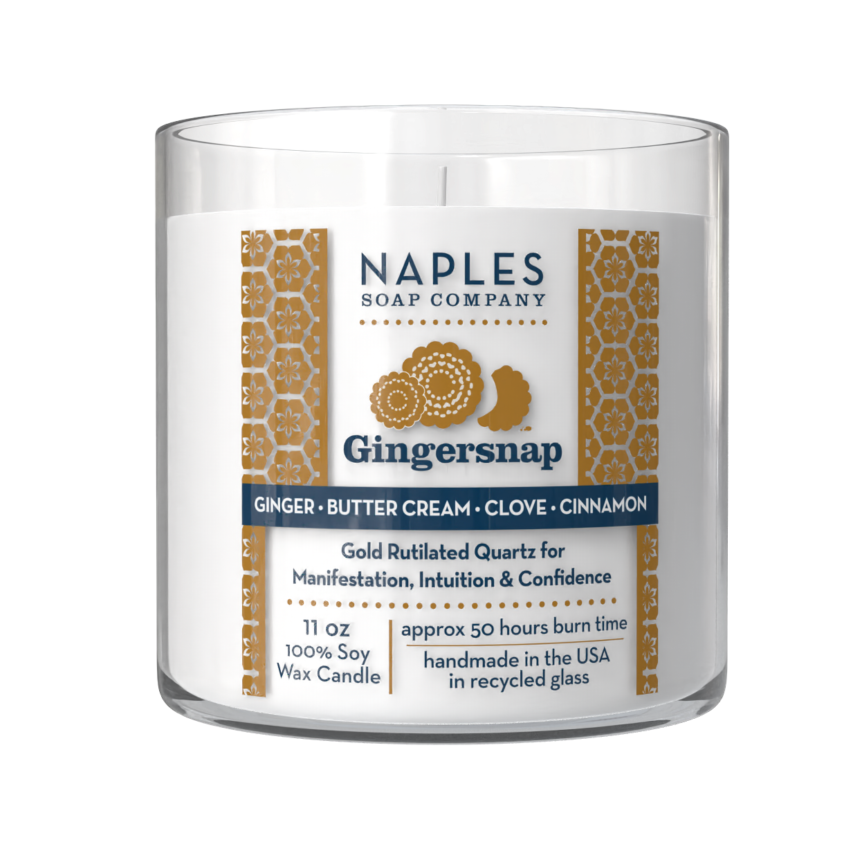 Sweet, spicy, and a little bit sassy Ñ our Ginger Snap candle fills your home with cozy holiday warmth. This hand-poured soy wax in a recycled glass jar burns for approximately 50 hours, releasing a mouthwatering blend of ginger, buttercream, clove, and cinnamon. Each candle is topped with shimmering gold rutilated quartz crystals, known to inspire intuition and confidence. Light it up and let the comforting aroma and golden glow bring a little extra sparkle to your season.