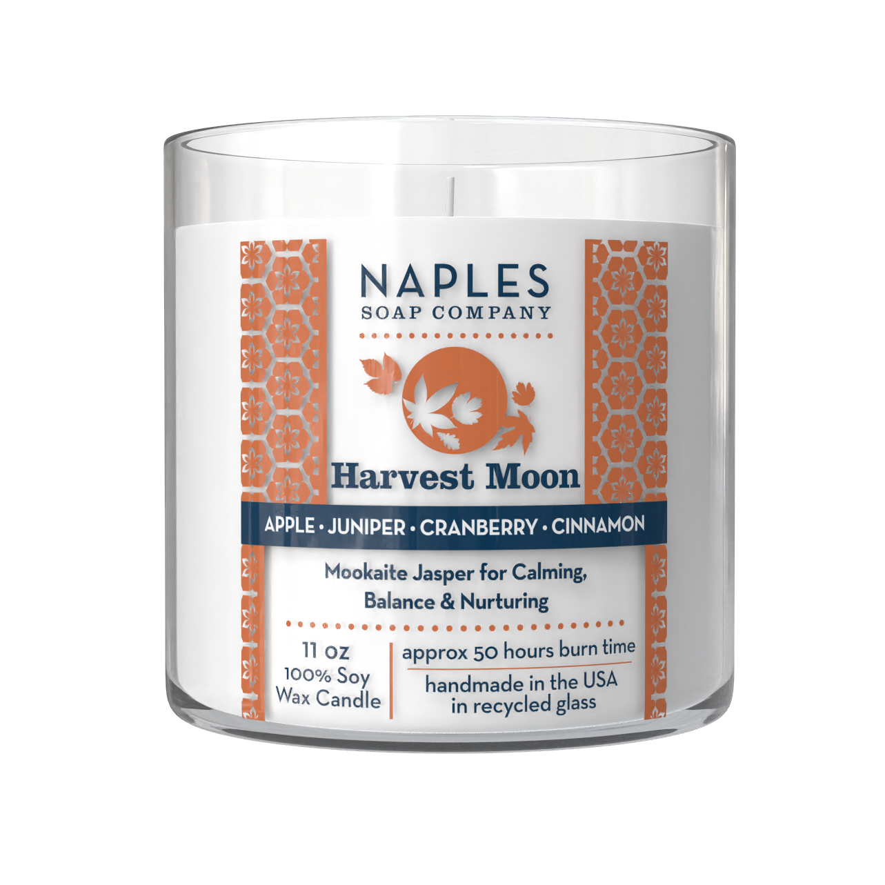 Capture the essence of crisp autumn nights with Harvest Moon. This long-burning (approximately 50 hours) soy wax candle is hand-poured into a recycled glass jar, blending apple, juniper, cranberry and cinnamon for a warm, comforting aroma. Topped with mookaite jasper stones, it inspires calming and nurturing energy, making every flicker feel like a cozy harvest embrace.