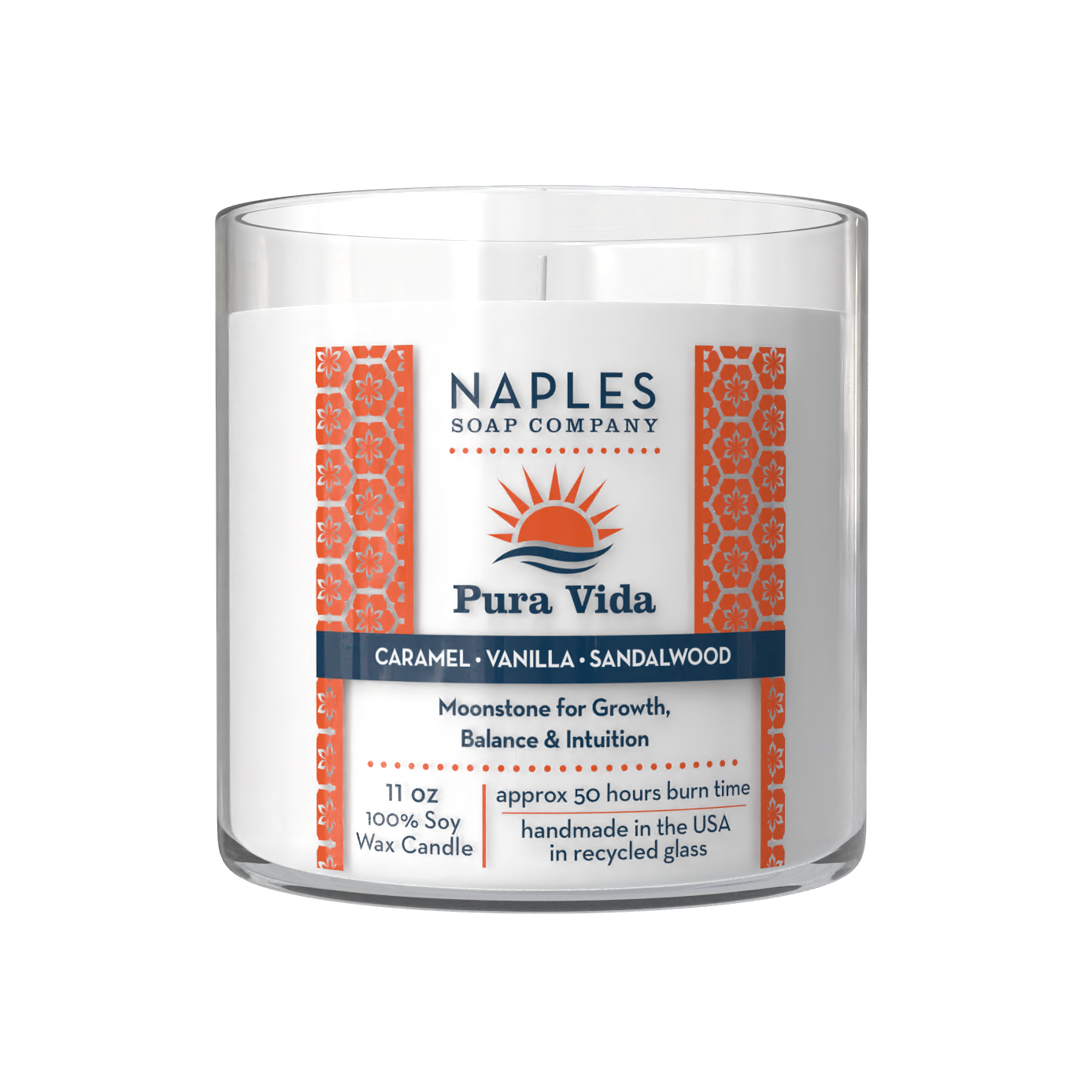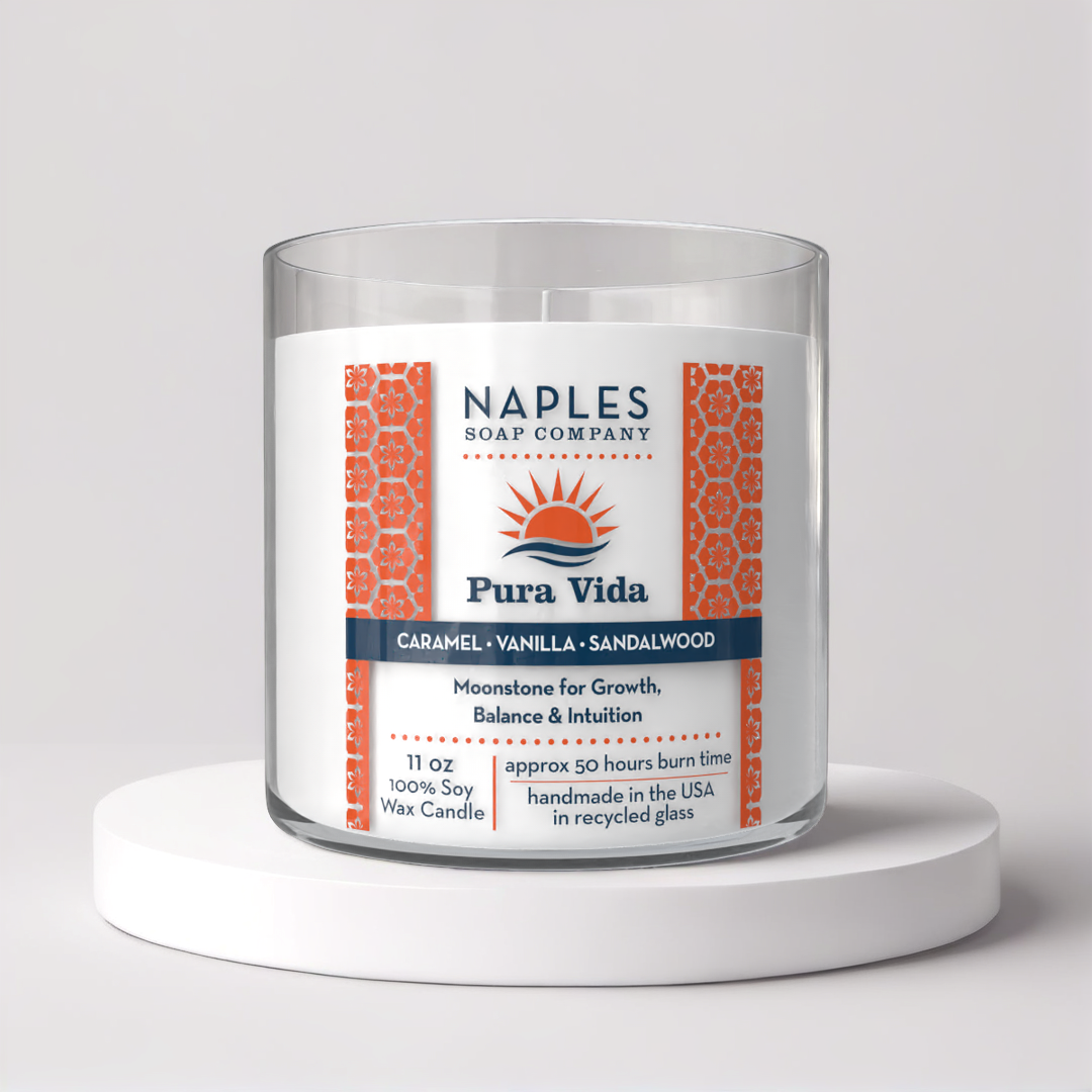 Find your calm with Pura Vida — a long-burning (approximately 50 hours) soy wax candle hand-poured into a recycled glass vessel. Indulge in the warm, creamy blend of white caramel, vanilla and sandalwood, a scent that feels both grounding and luxurious. Topped with moonstone crystals, this candle promotes balance and intuition with every gentle glow. A little everyday magic for your mind, body, and space.