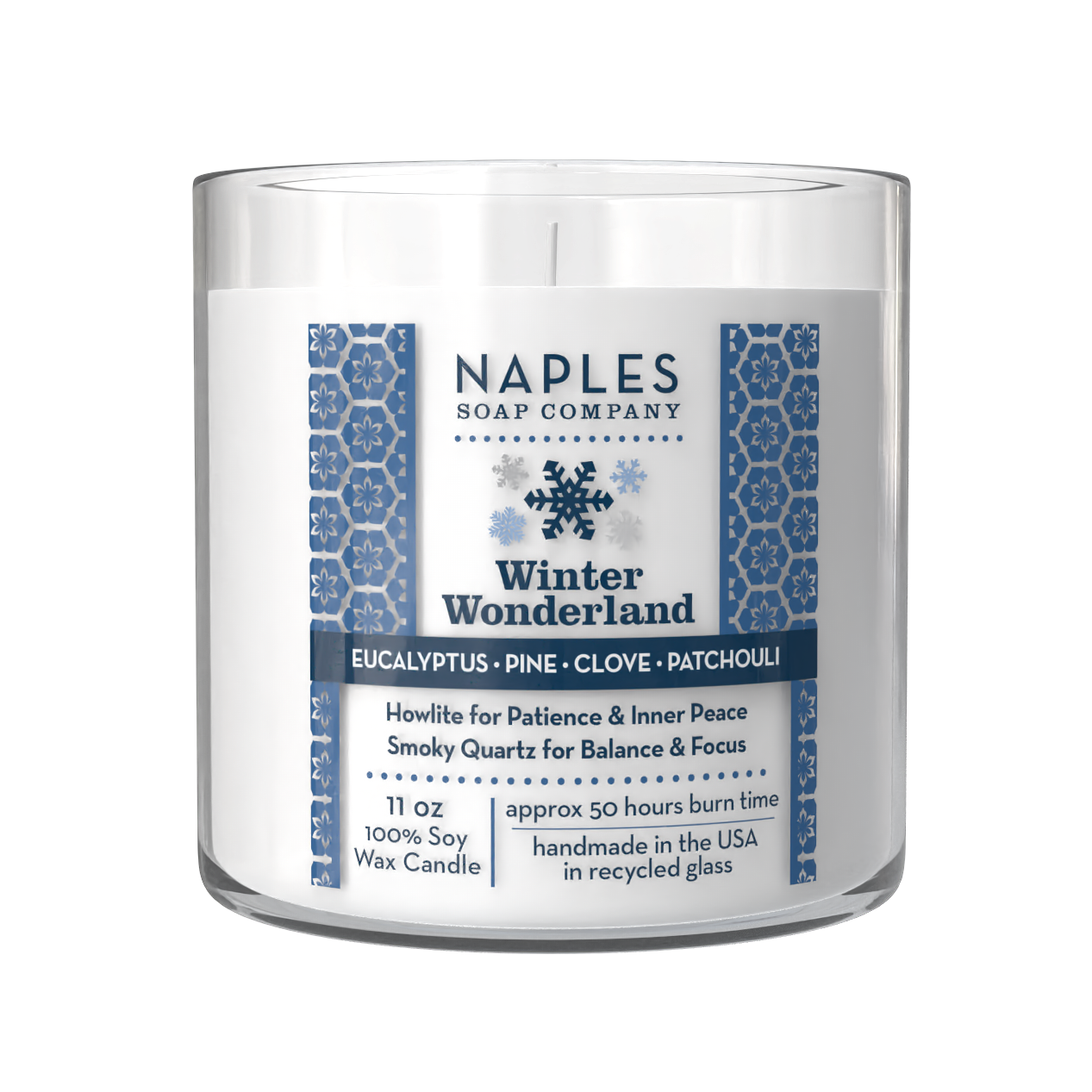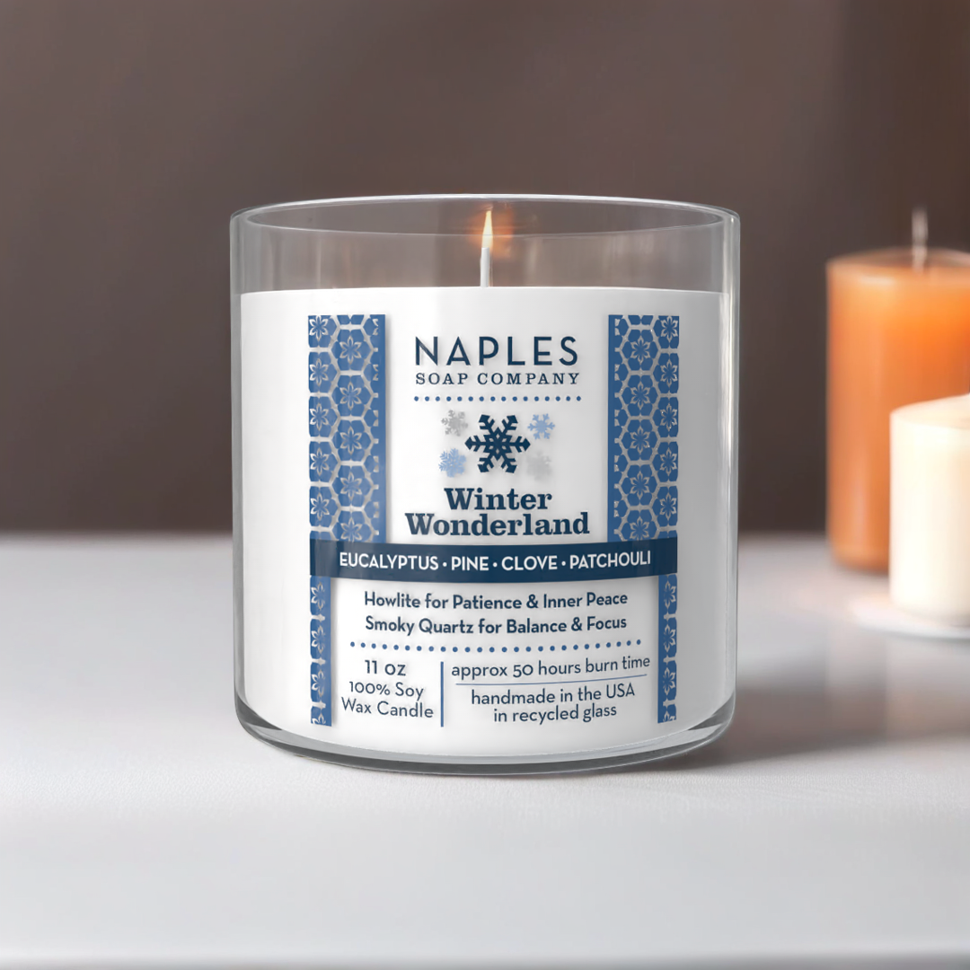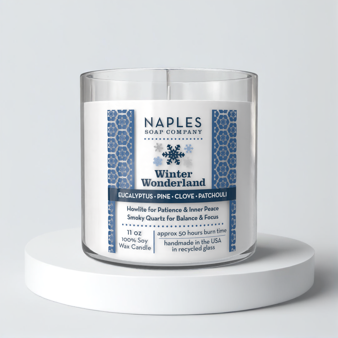 Crisp eucalyptus, fresh pine, warm clove and earthy patchouli come together to create an aroma that feels like a peaceful winter forest retreat. Topped with smoky quartz and howlite crystals, this long-burning (50 hours) candle invites balance, focus and patience with every flicker. Sustainably made, beautifully aromatic, and perfectly serene — it’s winter magic in a jar.